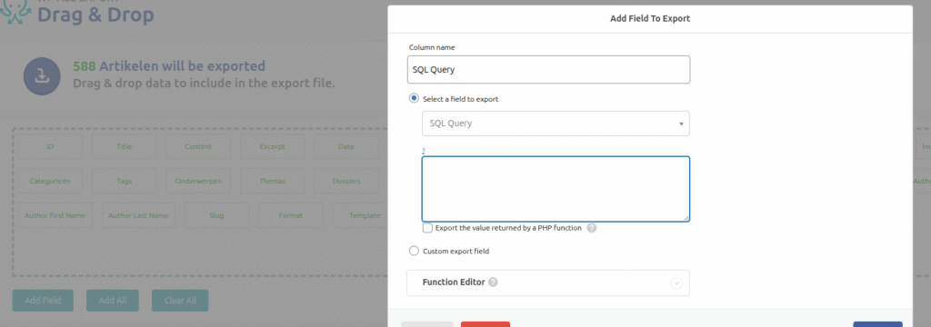 Warning: you may use any query as long as it returns just one variable. Also you can only use %%ID%%, and not others. It is possible to use shortcodes or even eval (! I don't think you want to use this. !) on the return value of that query. ( might need 1 or 2 other input fields, the one just below the textarea is the fieldPHP, but does not work in the free version ).