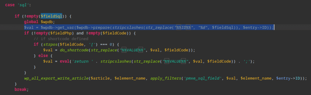 $val = $wpdb->get_var($wpdb->prepare(stripcslashes(str_replace("%%ID%%", "%d", $fieldSql)), $entry->ID));